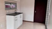 Meubles : Meubles hauts et bas en MDF blanc, avec un comptoir en granit et un évier en acier inoxydable